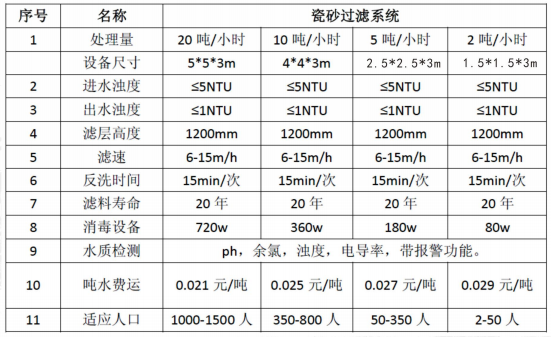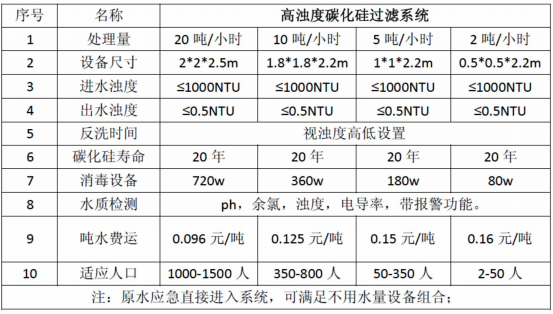 本系统采用高浊度(≤1000NTU) 原水经过自压(0.2MPa) 压进入过滤器,原水与瓷砂滤 料进行充分接触拦截,瓷砂能够截留水中大量杂质,出水浊度高于饮水标准指标,在经过0.1微 米孔径的碳化硅过滤系统,出水浊度能达到0.5NTU 以下,若原水质特别差时,本系统还能够 保证出水水质稳定,系统运行达到设定值时,自动启动设备切换进行反冲洗,无人值守自 动控制系统自动如此往复运行,保证饮水指标,达到安全供水。