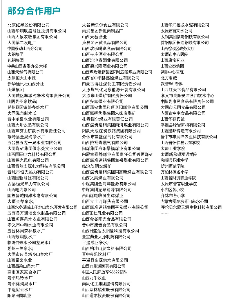 公司主要经营供水,在职员工有30人,与多家长治自来水厂黄页零售商和代理商建立了长期稳定的合作关系,品种齐全、价格合理,企业实力雄厚,重信用、守合同、保证产品质量,以多品种经营特色和薄利多销的原则,赢得了广大客户的信任,公司始终奉行“诚信求实、致力服务、唯求满意”的企业宗旨,全力跟随客户需求,不断进行产品创新和服务改进。